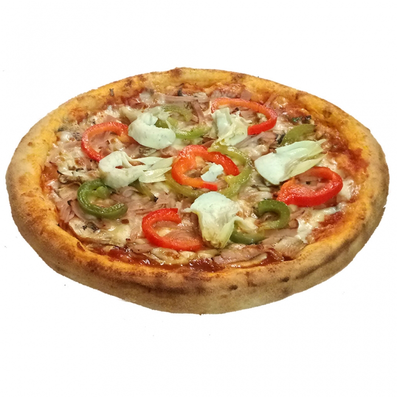 tomate, fromage 100% mozzarella, jambon, artichauts, poivrons, champignons frais