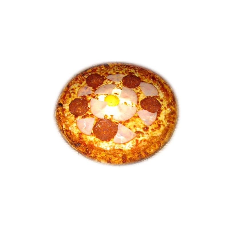 sauce tomate, double fromage 100% mozzarella, oeuf, bacon, chorizo