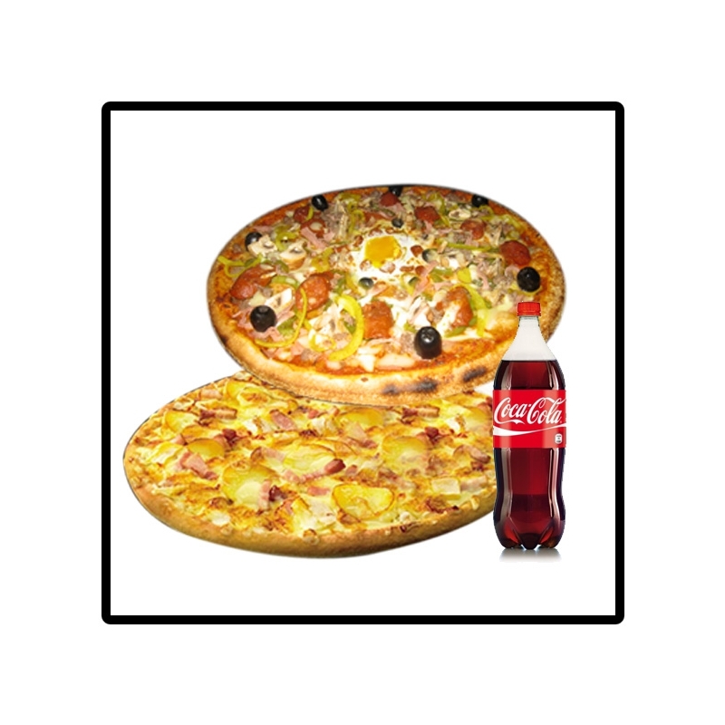 2 pizzas Méga au choix + 1 bouteille de Coca 1.5L