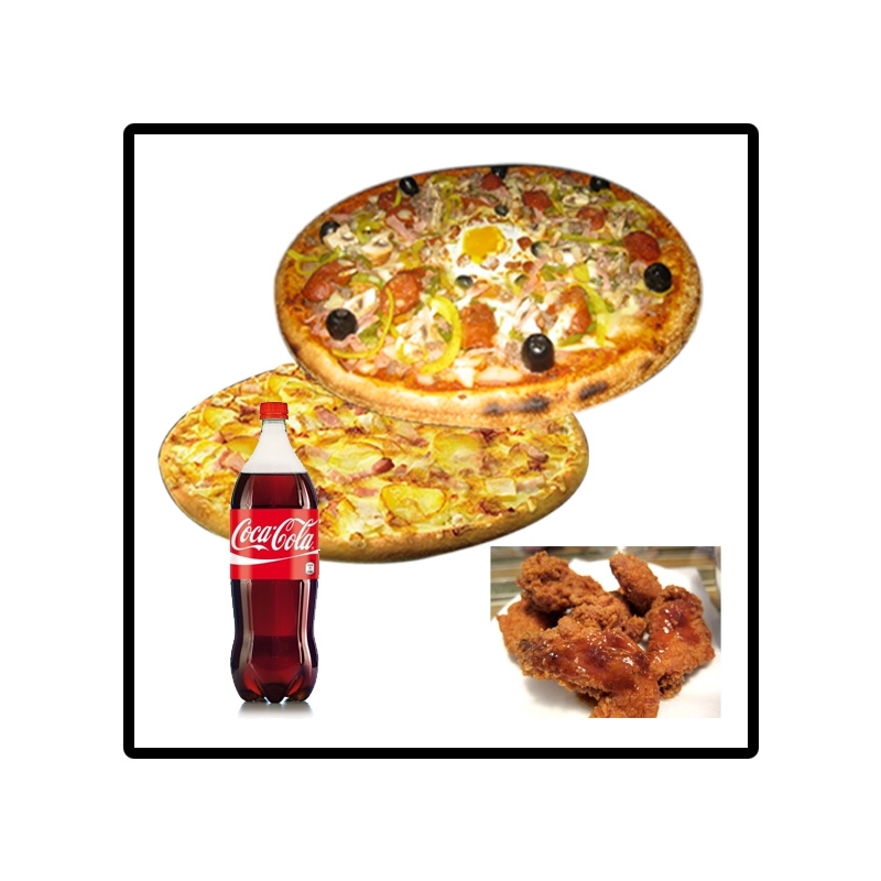 2 pizzas sénior+10 chicken wings+1 bouteille de Coca 1.5L