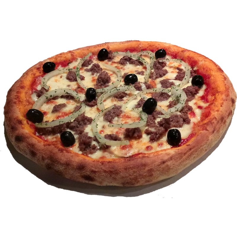 sauce tomate, double fromage 100% mozzarella, viande hachée, oignons, olives noires,sauce algerienne