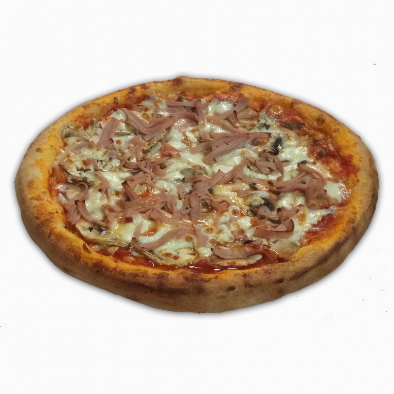 sauce tomate, fromage 100% mozzarella, champignon frais, jambon