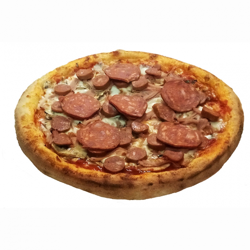 sauce tomate, fromage 100% mozzarella, jambon, merguez, chorizo, champignons frais