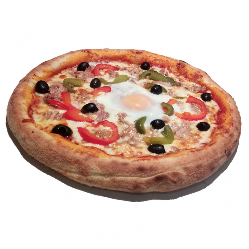 tomate, fromage 100% mozzarella, oeuf, thon,olives noires, poivrons